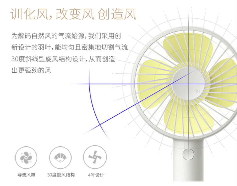主要功能:靜音電機、靜音扇葉、內置可充電鋰電池、無極調速。