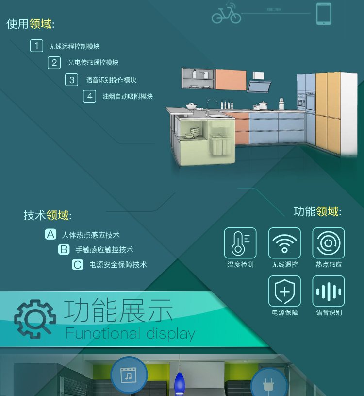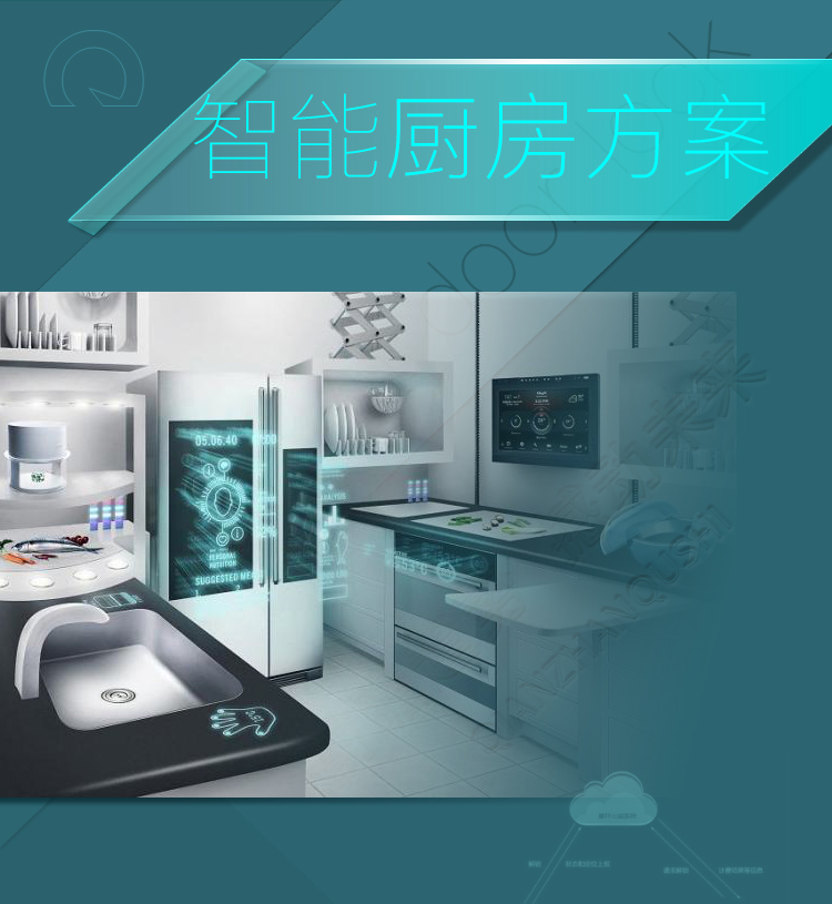 本方案通過對廚房設備三件套包括煙機、灶具、消毒柜分別嵌入智能模塊,并且設計成設備間聯動控制,形成一個完整的智能化整體廚房解決方案。