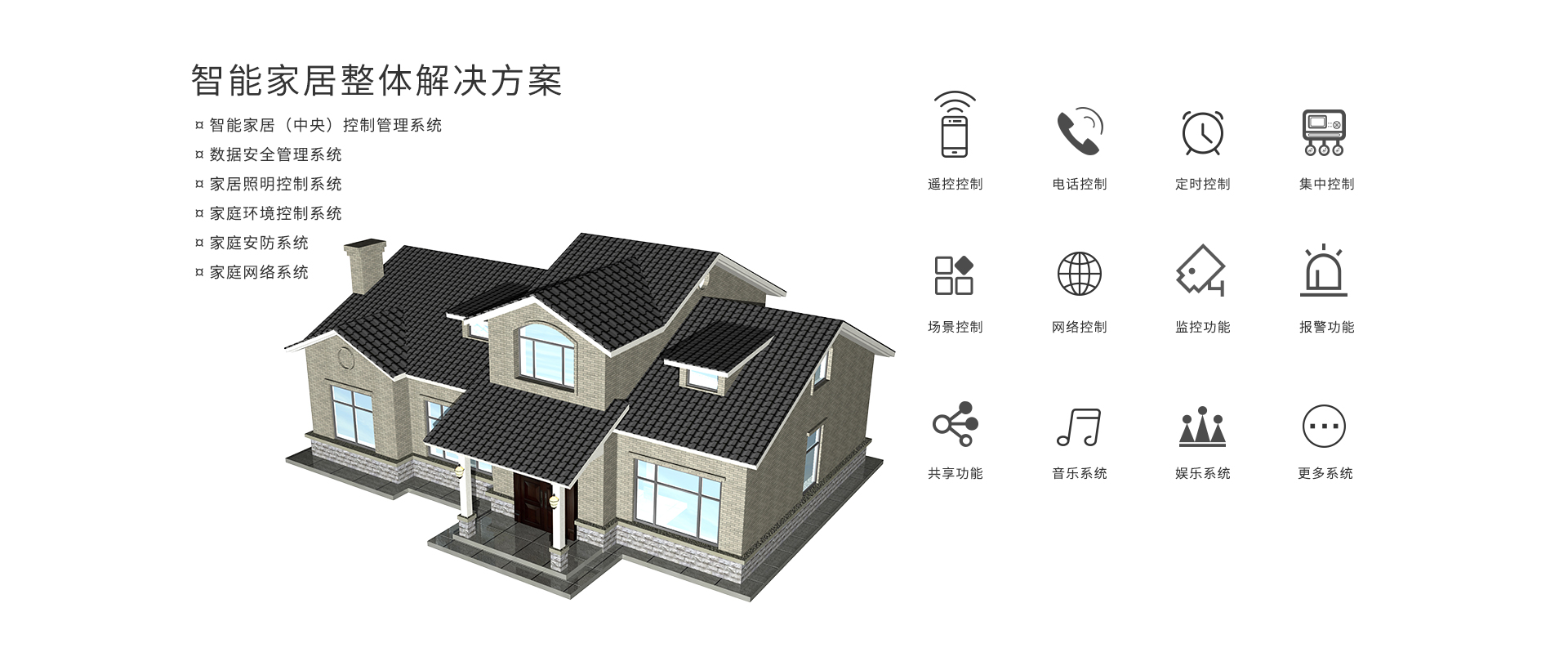 智能家居控制系統(tǒng)解決方案是提供給大戶型-復式、別墅的用戶,功能需求全面,區(qū)域面積大,需要集中管理控制,體現(xiàn)節(jié)能環(huán)保的新理念。別墅通常都設計配有花園管理系統(tǒng),安防報警系統(tǒng),監(jiān)控系統(tǒng),可視對講系統(tǒng),空調(diào)系統(tǒng),背景音樂系統(tǒng)等。